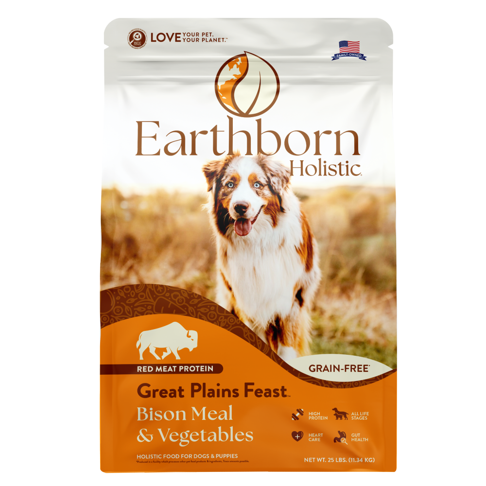 Earthborn Holistic Great Plains Feast is a high-quality dog food with bison meal protein and a mix of wholesome fruits and veggies. Made for all life stages, Great Plains Feast is a high protein dog food option and even includes pre-, pro-, and postbiotics to aid in gut and overall health for your dog. Also enriched with Taurine for heart health and vitamins and minerals for optimal nutrition, this grain-free and gluten-free dog food recipe is a tasty option for your dog or puppy.