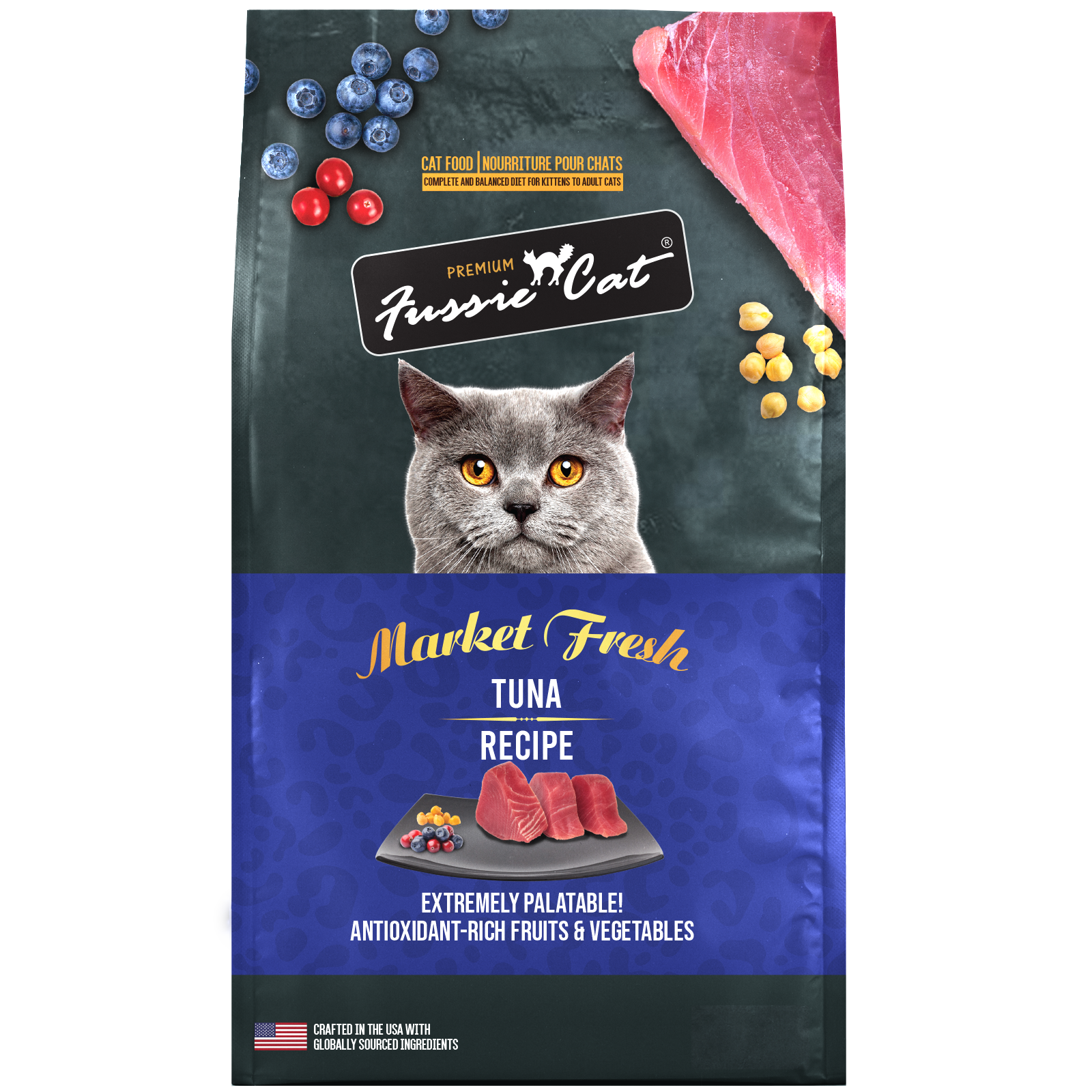 tuna, chicken meal, peas, chickpeas, chicken fat (preserved with mixed tocopherols), natural flavors, flaxseed, vitamins (niacin, vitamin E supplement, vitamin A supplement, thiamine mononitrate, pantothenic acid, riboflavin, pyridoxine hydrochloride, vitamin D3 supplement, vitamin B12 supplement, folic acid, biotin), fructooligosaccharides, dicalcium phosphate, taurine, dried dandelion greens, potassium chloride, salt, minerals (zinc proteinate, iron proteinate, potassium chloride, copper proteinate, manganese proteinate, sodium selenite, calcium iodate), mixed tocopherols (preservative), dried cranberries, dried blueberries, dried kelp, choline chloride, rosemary extract