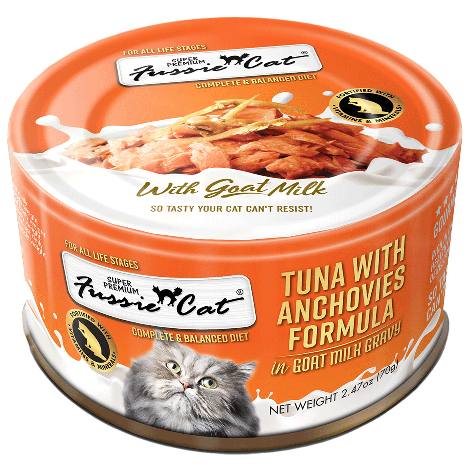 Tuna, Water Sufficient for Processing, Anchovy, Goat Milk, Sunflower Seed Oil, Tapioca Starch, Tricalcium Phosphate, Calcium Carbonate, Xanthan Gum, Choline Chloride, Taurine, Fructooligosaccharide, Guar Gum, Zinc Sulfate, Vitamin E Supplement, Thiamine Mononitrate, Nicotinic Acid, Calcium Pantothenate, Vitamin A Supplement, Manganese Sulfate, Ferrous Sulfate, Copper Sulfate, Riboflavin Supplement, Pyridoxine Hydrochoride, Folic Acid, Potassium Iodide, Menadione Sodium Bisulfite Complex, Vitamin B12 Supplement.