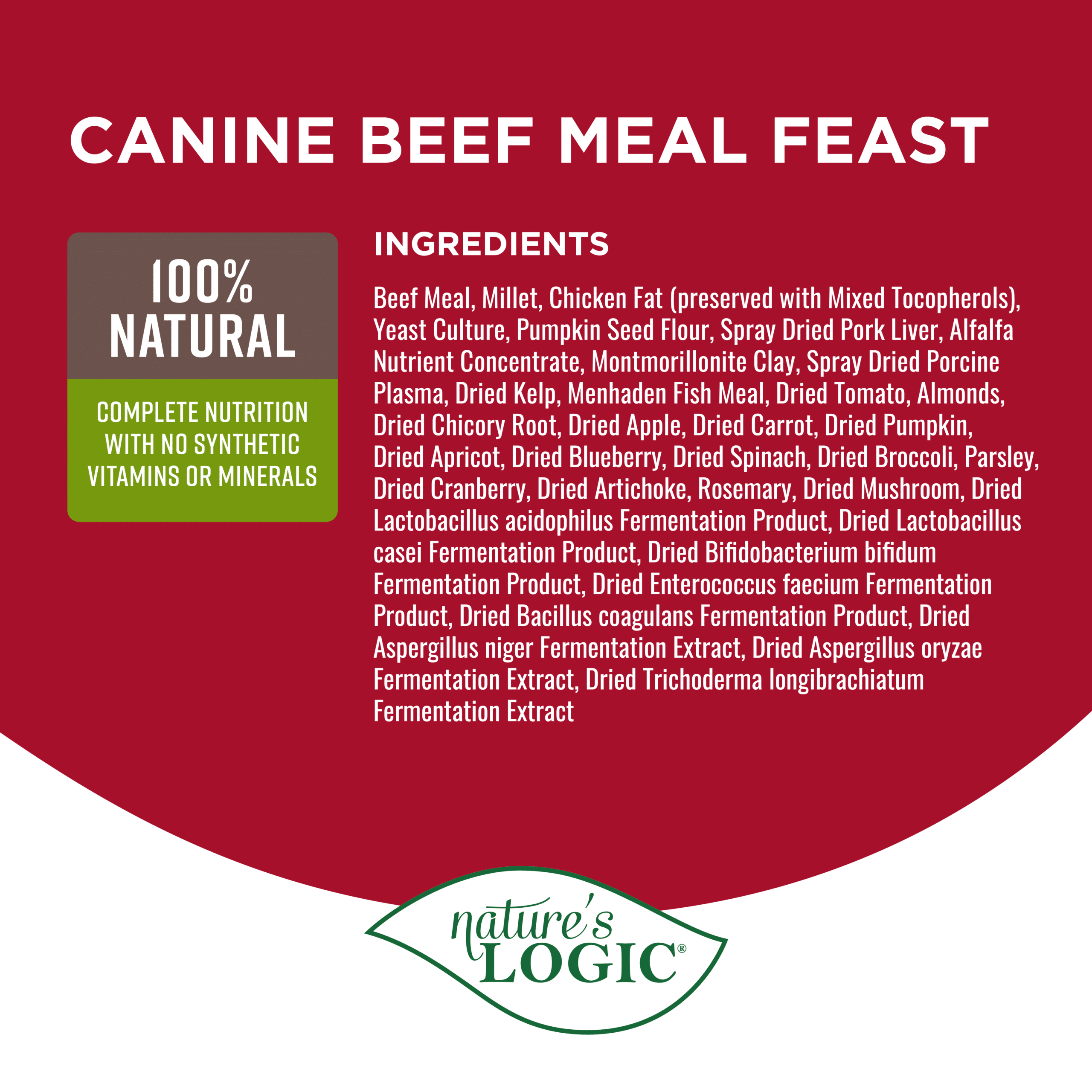 Nature’s Logic Canine Beef Meal Feast delivers 87% of its protein from high quality meat sources and features beef meal as the first ingredient. It contains no peas, potatoes, corn, wheat, or soy. It is gluten free and includes prebiotics and probiotics to support healthy digestion. Like all Nature’s Logic kibbles, this recipe delivers its nutrition through wholesome and natural ingredients and contains no added synthetic vitamins and minerals. It’s complete and balanced for dogs of all ages, sizes, and breeds.