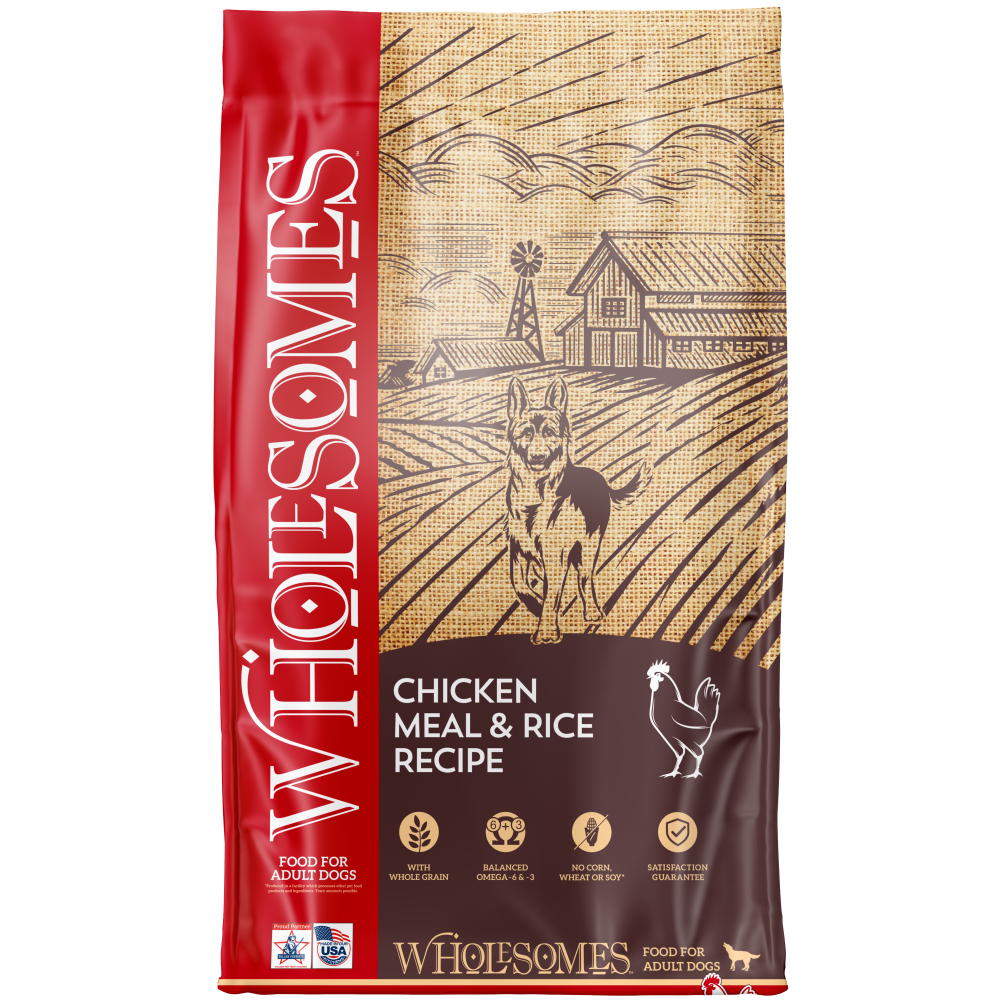 Wholesomes Chicken Meal & Rice is designed for dogs needing a high energy food from a single source high-quality chicken protein. Chicken Meal & Rice nutritionally balances Omega-6 and Omega-3 fatty acids to promote healthy skin and hair coat. The addition of vegetable fibers help support good digestion. Chicken Meal & Rice supplies your dog with a 100% complete and balanced diet for a healthy active life.