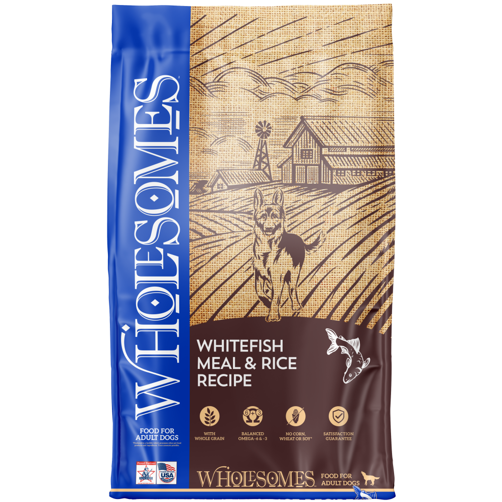 Wholesomes Whitefish Meal & Rice is designed to help support overall health by using high-quality fish meal as the principal source of protein. Whitefish Meal & Rice is made without high-moisture protein sources or common grains like corn, wheat or soy. Whitefish Meal & Rice nutritionally balances Omega-6 and Omega-3 fatty acids to promote healthy skin & hair coat. The addition of vegetable fibers helps support good digestion. Whitefish Meal & Rice supplies your dog with a 100% complete and balanced diet for a healthy active life.